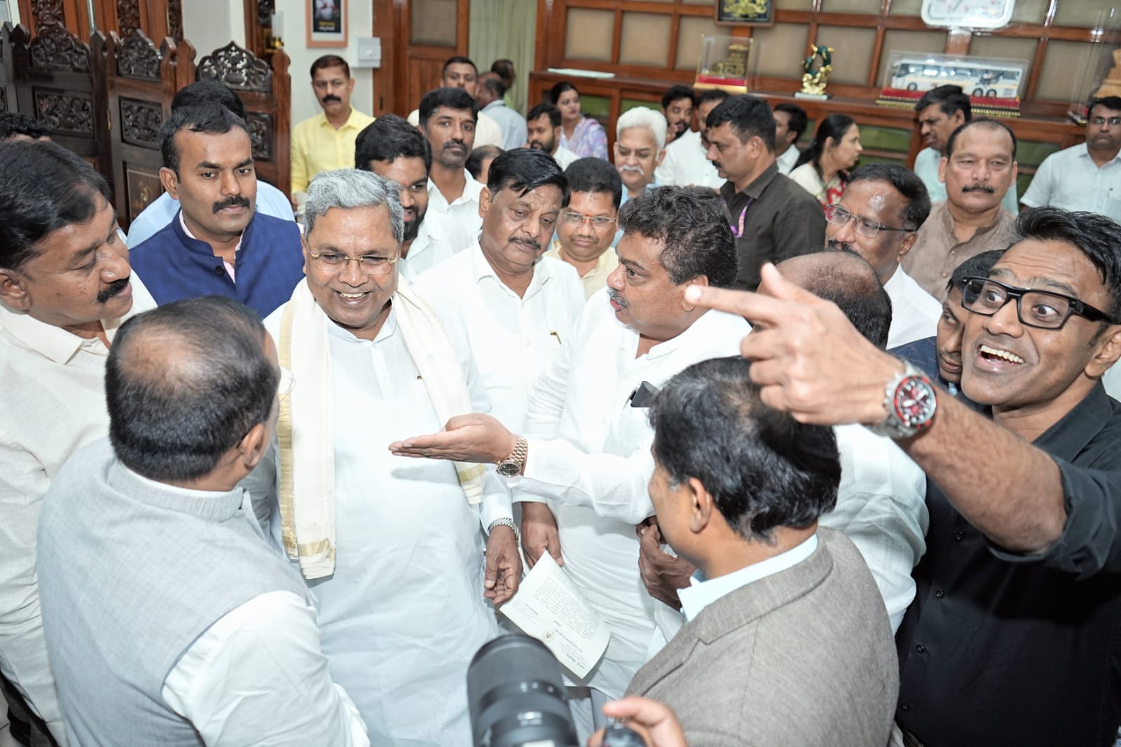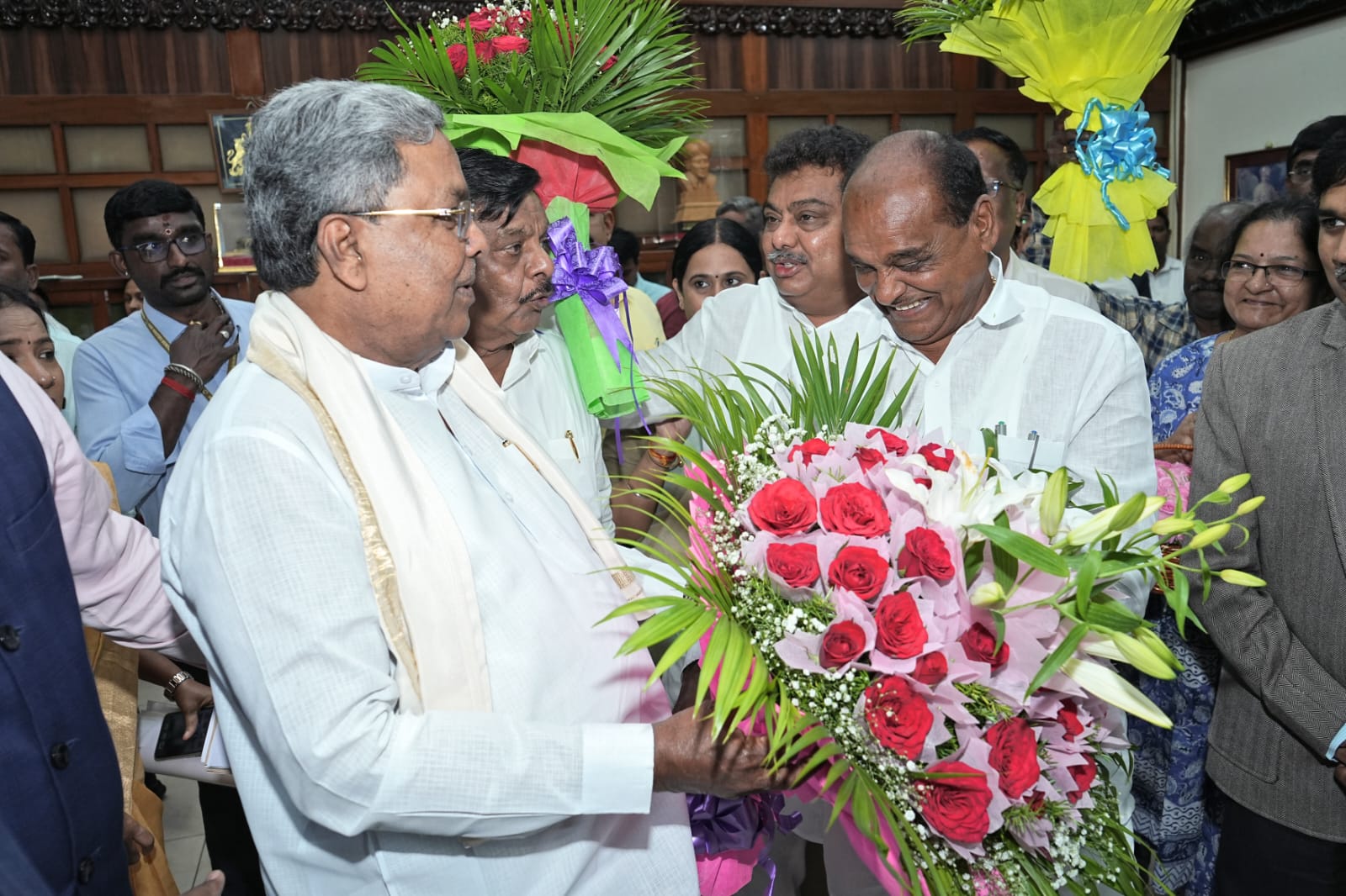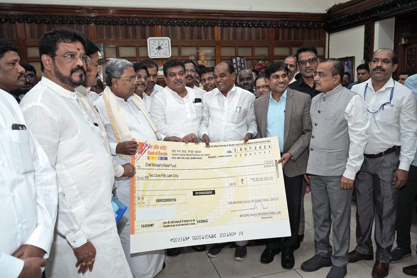 Hon'ble Minister for Commerce & Industries Sri. M.B. Patil and Sri Puttarangashetty, MLA, Chairman MSIL, handed over the MSIL donation check of 2.5 Crore Rupees towards Chief Minister Relief Fund to Hon'ble Chief Minister Sri. Siddaramaiah ji. During this time Chief Minister was also briefed about development and performance of MSIL. Sri Manoj Kumar, IFS, MD MSIL and senior executives were present during the occasion.